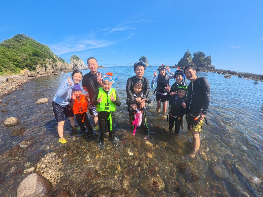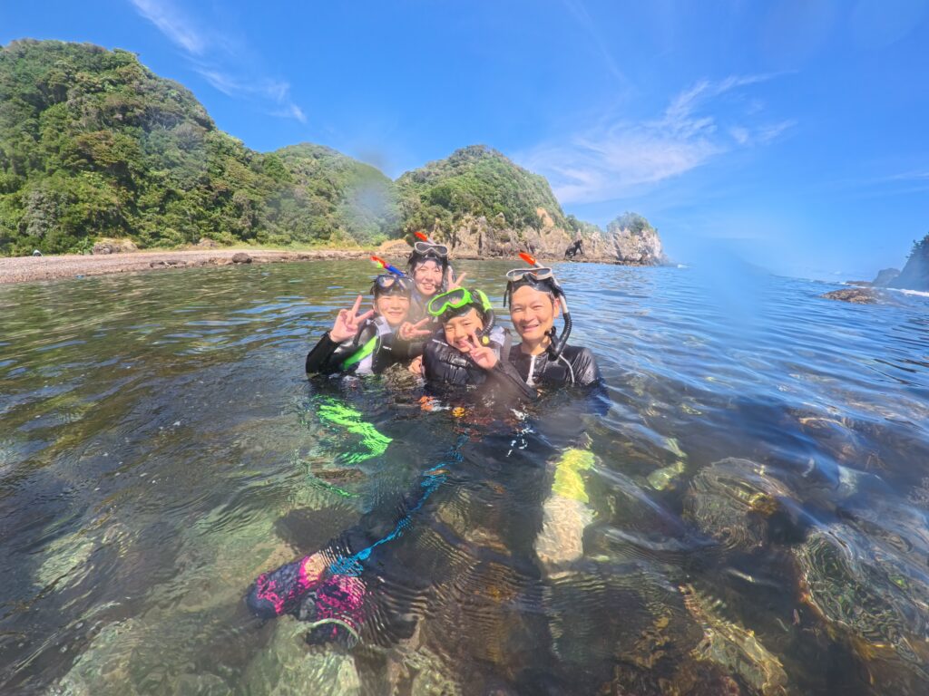 シュノーケリングが凄い楽しくてたまりませんでした。毒を持った魚がいてビックリしました。小さな魚がいっぱいいたからビックリしました。磯探検は石をどけたらヤドカリやウニがいっぱいいて凄くビックリしました(by次女)。磯探検でナマコやウニが岩の下などにいてとてもビックリしました。ナマコを投げられた時、とてもビックリしたけどネバネバしたものを吐き出して驚きでした。シュノーケリングでは、色々な魚がいて形や大きさ、色などさまざまで、とても楽しかったです。特に大きい魚を見つけた時は、はしゃいでしまって少し尾行してました(笑)。また機会があればもう一回やりたいです!貴重な体験をさせてくれてありがとうございました(by長女)!海なし県の埼玉から参加したので全てがビギナーの家族でしたが、問題なく参加できました。ひとえにキャプテンの知識、人柄によるものと感謝してます。キャプテンは大学でも海洋学部出身という海のプロということで、知識も豊富で解説がとても楽しめました。また、親しみやすい人柄で、子ども達とも気さくに話してもらえました。子ども達も「キャプテン」と呼んでいろいろ質問できてうれしそうでした。そして、体験した海辺は子どもでも足が着く安全な場所でしたが、魚はいろいろ見られました。小さい魚から大きなやつまで近くで泳いでおり、手を伸ばせば捕まえられそうでした。海なし県人としては、充分に満足できました。ありがとうございました(by父)。