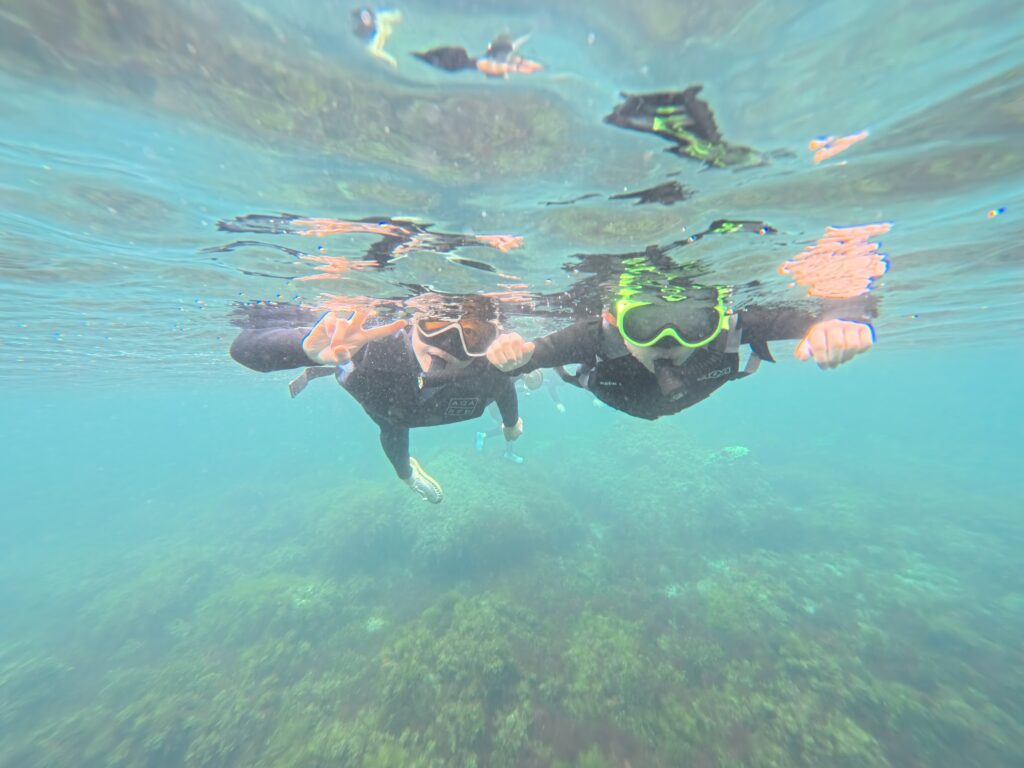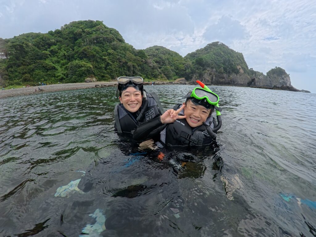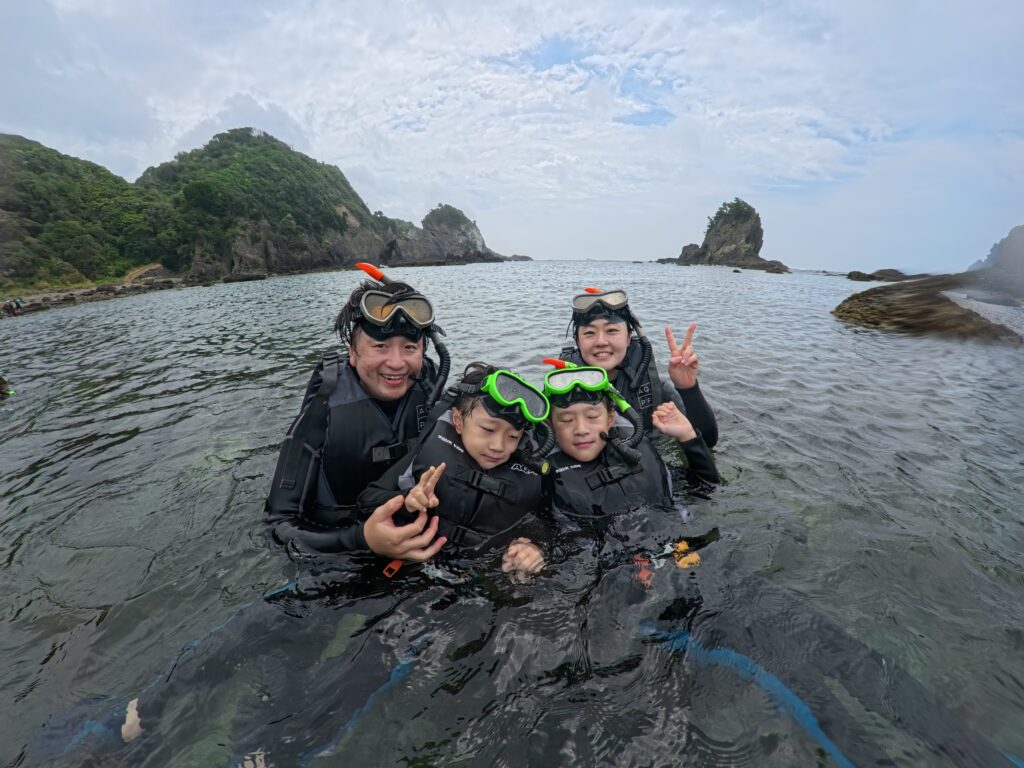 小学生2人、大人2人で参加しました。シュノーケリングは初体験でしたが、丁寧にレクチャーしていただき、家族全員とても楽しむことができました!まずシュノーケルマスクを着けて、海の中をのぞいた瞬間、美しい光景に感動しました。透明度がとても高い日だったそうで、ニシキベラ、ルリスズメダイ、カゴカキダイなど色とりどりの美しい魚を沢山見ることができました。イカやイワシの群れもとても神秘的で、ずっと一緒に泳いでいたいと思うほど…。子ども達は魚に興奮しつつも、磯のナマコを怖がったり、寒くなってしまう場面もありましたが、キャプテンに上手くフォローしていただき、楽しい夏の思い出になったようです。本当にありがとうございました!