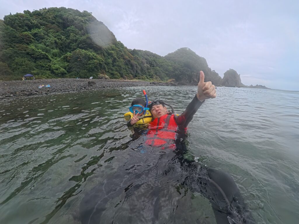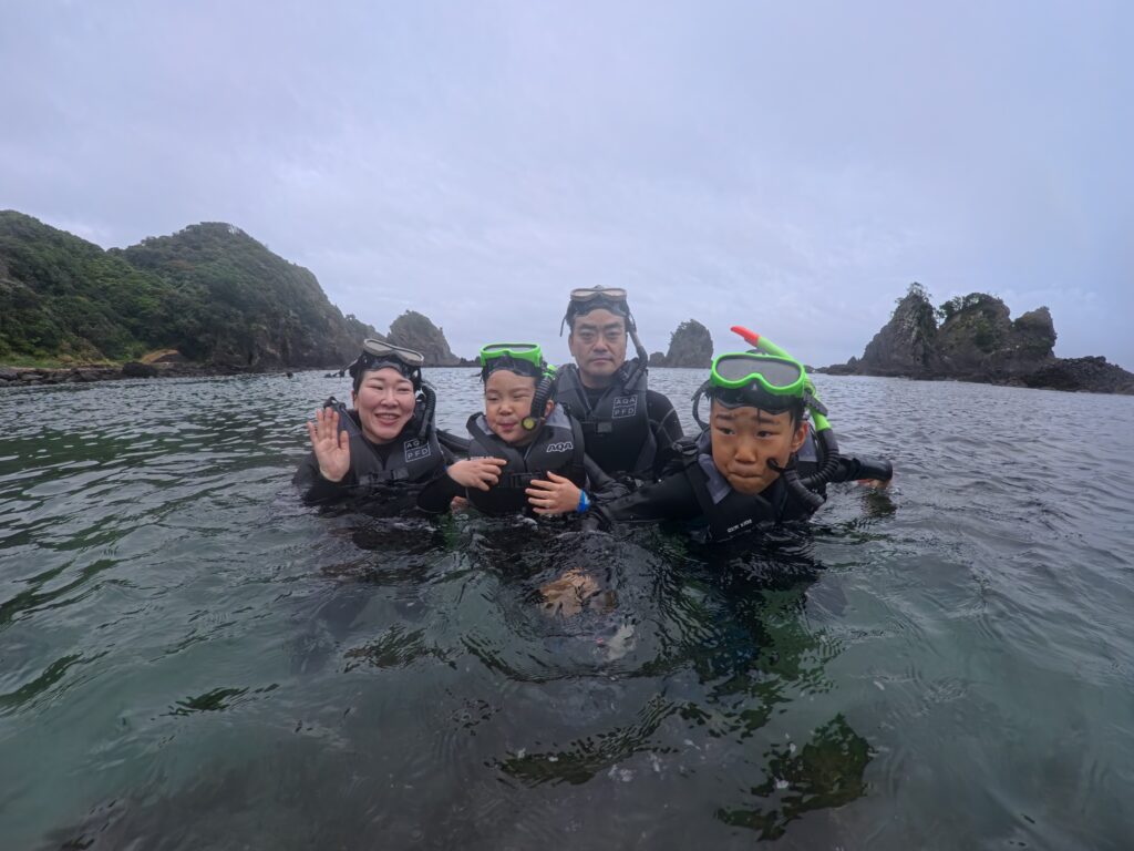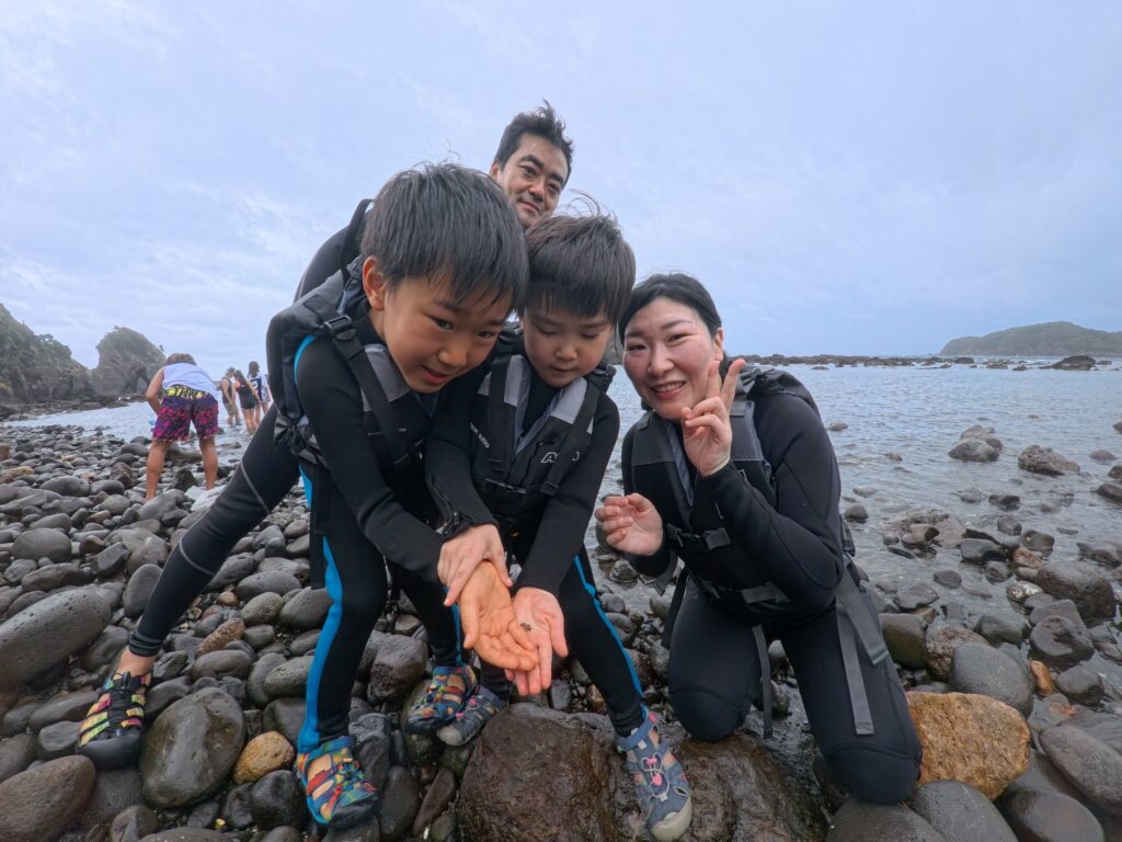 小学2年生と年長の子供達を含む家族4人で参加致しました。南伊豆には何度か足を運んだことがあり海水浴やSUPはやったことがるのですが、以外にもシュノーケリングは初めてということもありとても楽しみにしておりました。今回の旅はこの体験のために泊りがけで参加したと言っても過言ではありません(笑)。最初はウエットスーツやシュノーケルの使い方等の基本から丁寧に教えて頂きました。簡単そうですが、意外と知らないこも多くとても勉強になりました。(特にヨモギの使い方には驚きました!)。体験は子供達の大好きな磯遊びからのスタートでしたが、転がっている岩を動かすまでもなくたくさんの蟹やヤドカリたちが彼らを出迎えてくれました。夢中で探して、採った蟹を嬉しそうな表情で見せてくれる子供達を見て「やっぱり連れてきて良かったな。」と親としてあらためて感じました。シュノーケリング体験に移り、海の中に進むときは当日の天気も相まってか普段水泳教室に通っている彼らも多少怖がっていましたが、徐々に慣れて海中を泳ぐ魚たちに声を上げて興奮しているうようでした。さすが南伊豆の海と思う程の相変わらずの透明度で、美しい魚たちに親の私達も見惚れていました。明るく元気なキャプテンに子供達も懐いていたようで、海のことや生き物のことについてなんでも聞いているようでしたし、キャプテンも子供達の何気ない話に全て笑顔で返してくれており子供達も大満足の様子でした。今回は本当にありがとうございました。また、南伊豆方面へ旅行の際は参加したいと思います。その際は是非またよろしくお願い致します。