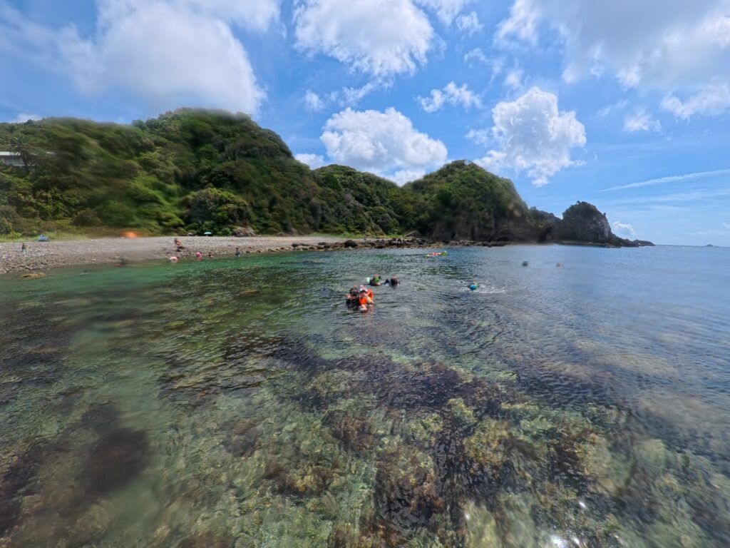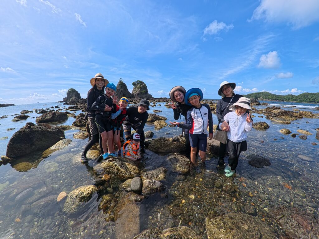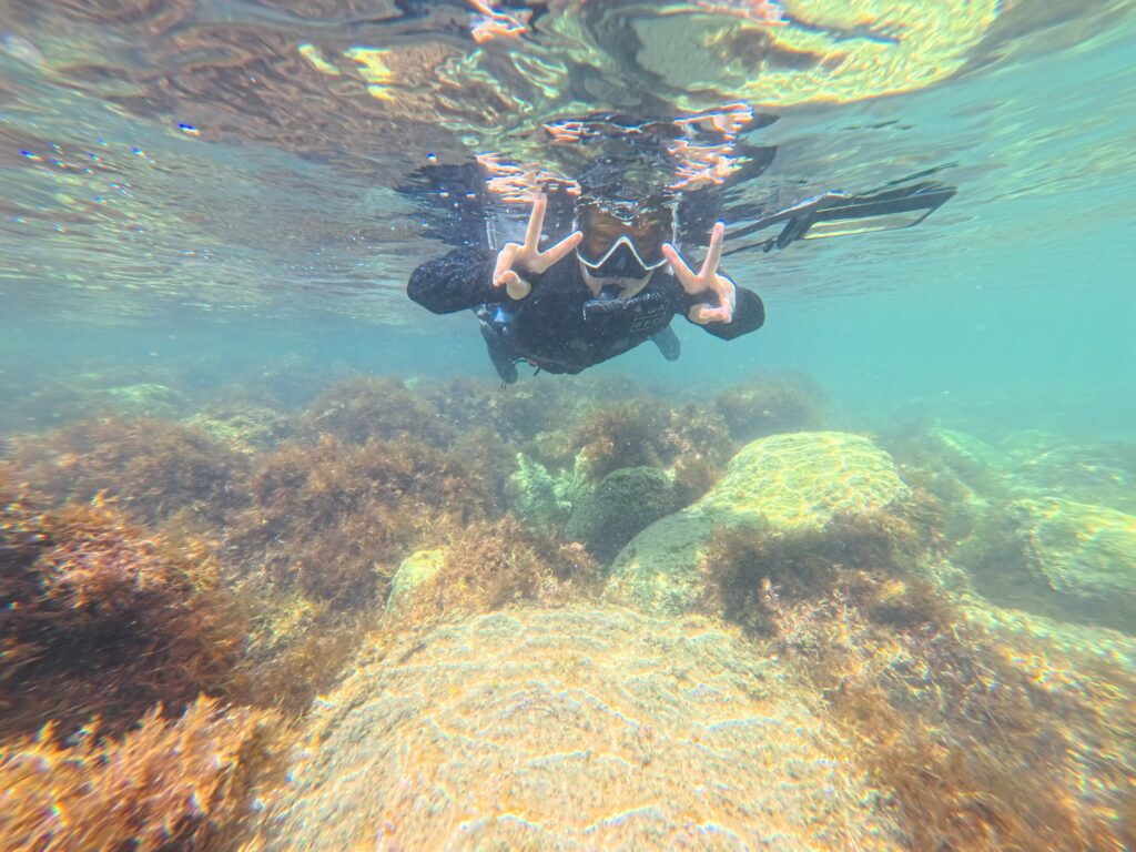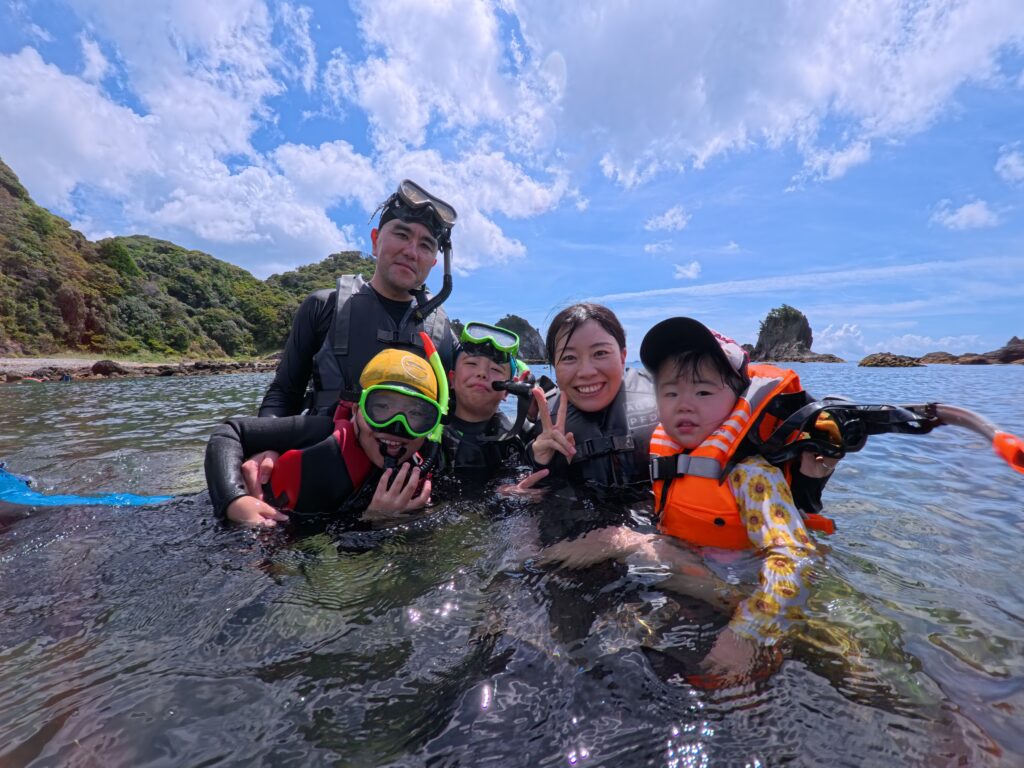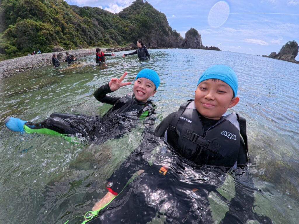 親の感想→少し潜るだけでたくさんの魚を見ることができ、親子ともども大変楽しい時間を過ごせました。昨年個人で訪れたときに、魚の多さに驚きましたが、沖に向かってどこまでいっていいかもわからず楽しみきれなかったので、広い範囲を楽しめました。シュノーケリングか磯遊びかどちらかという体験コースはよくありますが、両方できるというのが珍しく、非常によかったです。また子供のウェットスーツも借りることができたので、冷えや怪我防止ができ、安心できました。終わった後の温水シャワー、アイスのサービスも嬉しく充実した時間を過ごせました。ありがとうございました。子の感想→私が心に残ったことは全部心に残ったけれどとくに心にのっこたのは三つあります。一つ目は海の水が透明で綺麗だったことです。二つ目はシュノーケルが楽しかったです。どんなところが楽しかったと言うと色々な魚がいたことです。虹色の魚がいたり青い魚がいたりしていて綺麗だったです。三つ目はナマコの尿が海水だったことです。