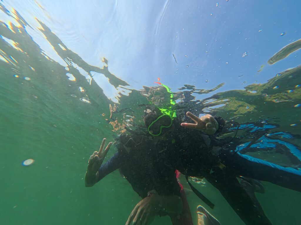 子供たちにとっての初めてのシュノーケルでしたが、ライフジャケットの付け方、マスクの付け方、浮き方を教えていただき安心してスタートすることができたようでした。また、シュノーケル前の磯の生き物の観察も子供たちの緊張をほぐすいい体験だったように思います。妹のほうは泳げないこともあり心配もありましたが、いざ海に入ってみたらたくさんの魚を見ることができ、興奮していました。こんな間近でいろいろな魚を見ることができ本当に楽しかったようです。キャプテンのところで子供たちの初シュノーケルを体験させてもらって本日に良かったです!